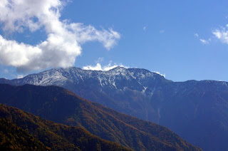 山脈の主赤石岳は、赤石から小赤石にかけ白く染まっており今年も冬の訪れを告げている。この雪がそのまま根雪になるとは思えないが白く染まり高さを誇りに見せていた。小赤石の西側の山面に雪が吹き付けると横方向の縞模様が見える、これもエベレストのイエローバンドではないがこの山脈が堆積層の隆起によってできあがっている事がよく分かる。ウエストンが川を渡る事20数回と言った懐の深い山赤石は、長野県側から見れば本当に奥深くに横たわる山だ。